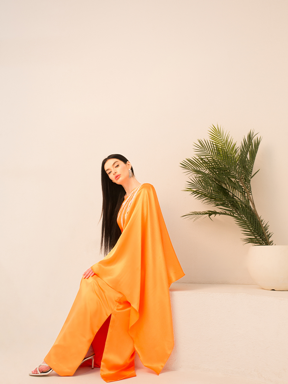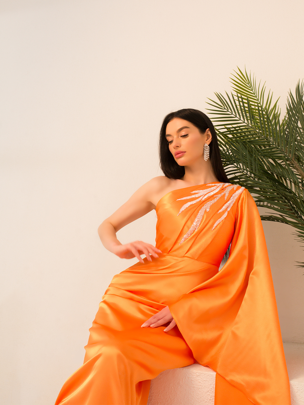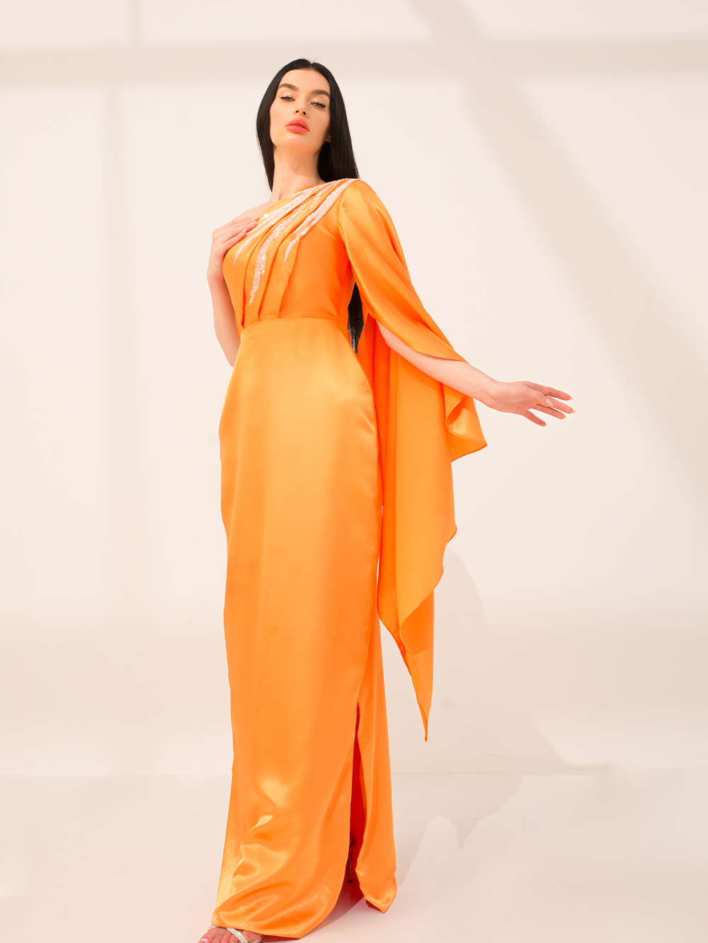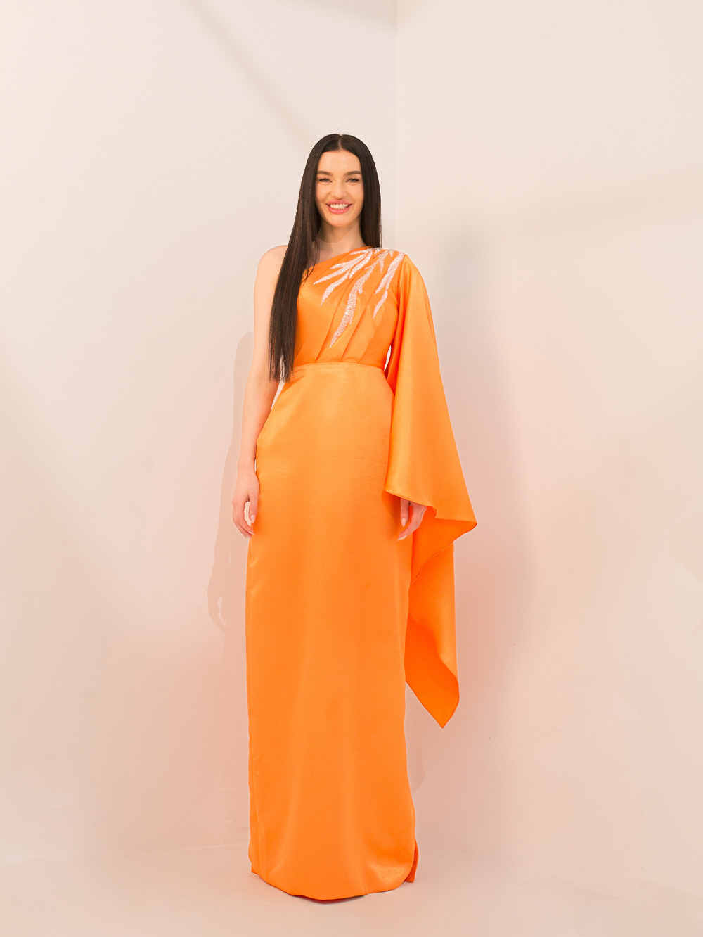 Chandra dress is made of silk fabric with soft lining, features shoulder embroidery, and has a maxi cut that comfortably fits the body.
