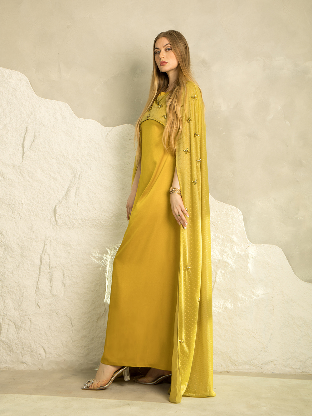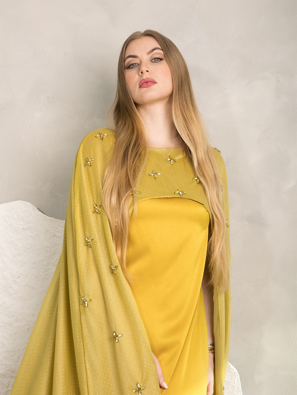 • Delicately hand-embroidered details on the cape elevate the design with a dramatic yet elegant flair.