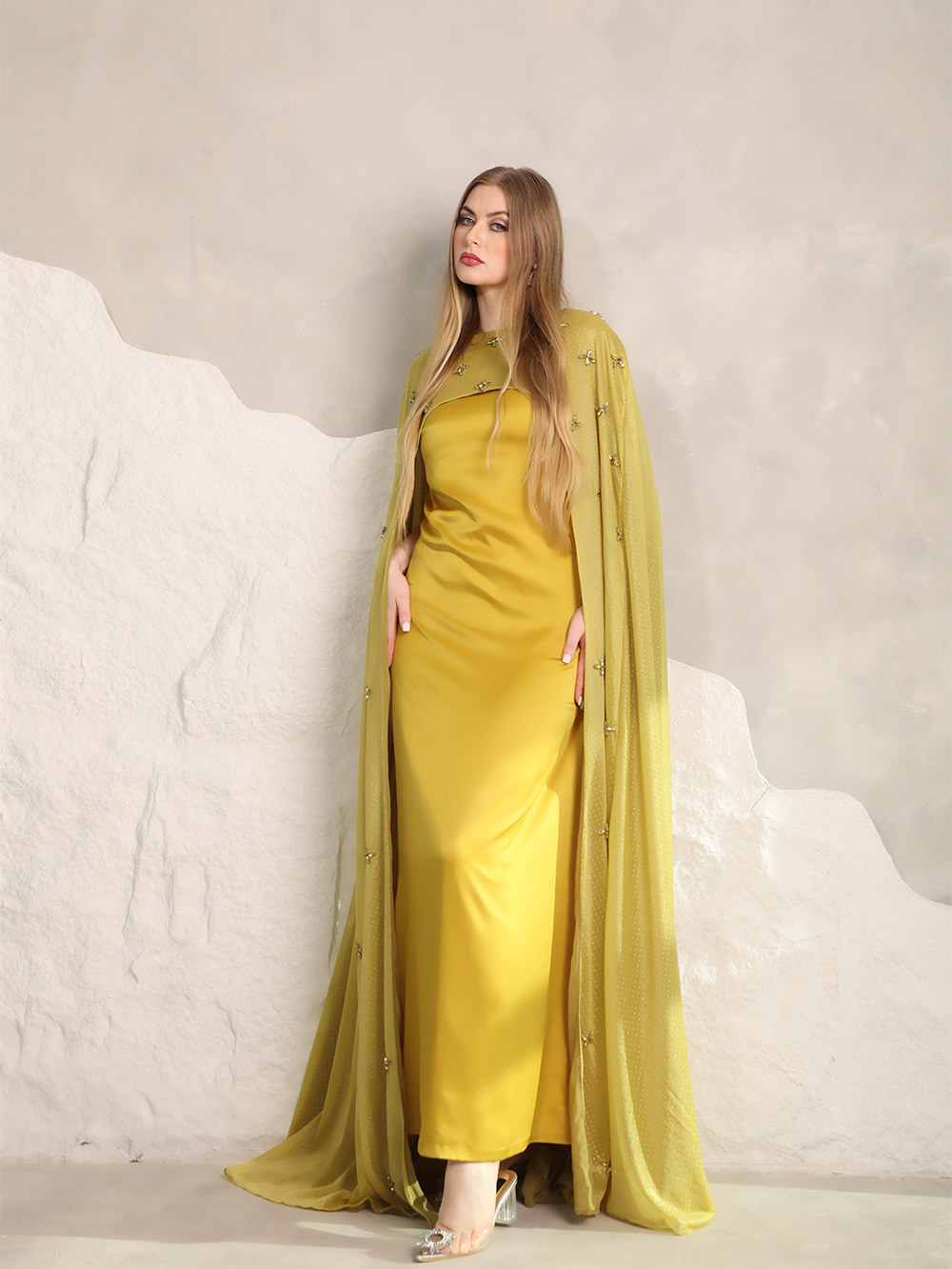 The Celestial Grace Gown radiates regal elegance, blending simplicity with luxury. Crafted from soft fabric in a rich olive khaki hue—a timeless shade that exudes sophistication and versatility—it gracefully enhances natural curves with a sophisticated touch.