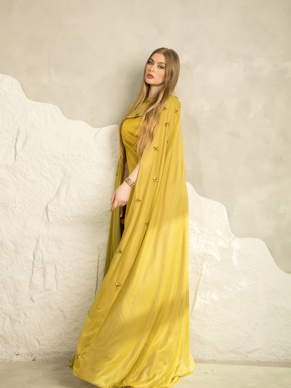 • A sheer cape adorned with intricate embroidery inspired by sparkling stars adds a celestial charm.